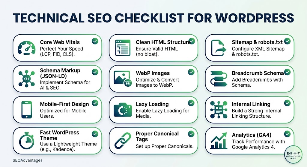 If you want to rank in Google and appear in AI search engines, your technical infrastructure must be flawless. Here is the exact 12-point technical SEO checklist I use to build high-authority WordPress architectures.